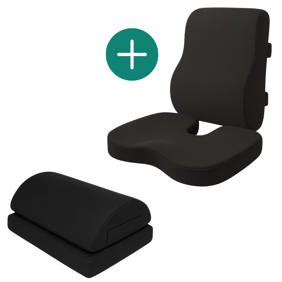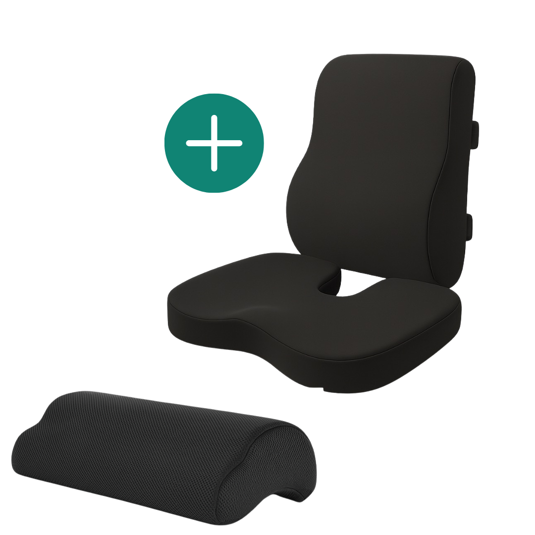 Sag Rückenschmerzen den Kampf an – mit unserem ergonomisch abgestimmten Set für langes Sitzen im Büro oder Homeoffice. Dieses Bundle wurde speziell dafür entwickelt, deine Wirbelsäule zu entlasten und deine Sitzhaltung langfristig zu verbessern.